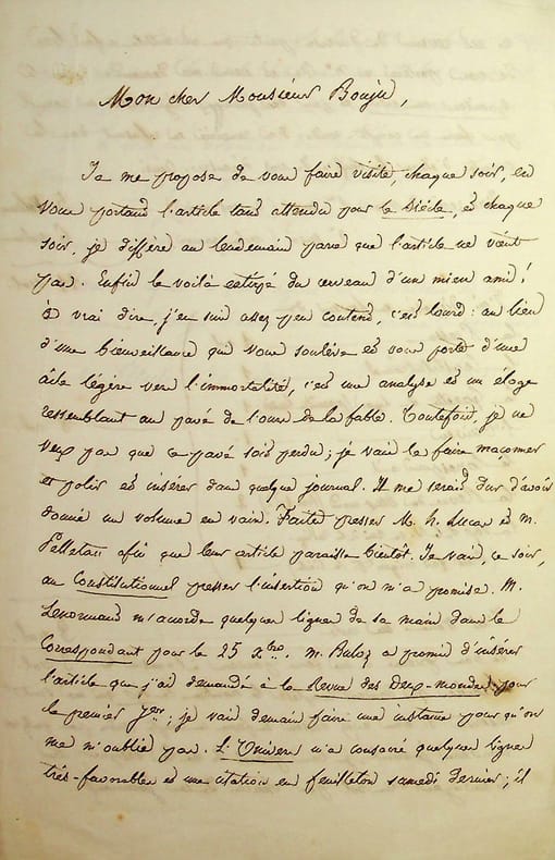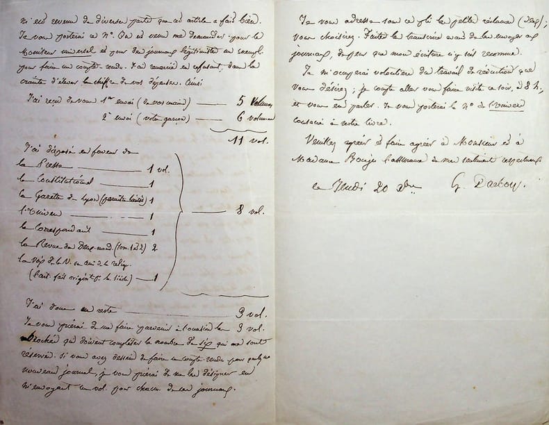 Georges Darboy (1813-1871), évêque de Nancy puis archevêque de Paris, fusillé par la Commune le 24 mai 1871. L.A.S., jeudi 20 décembre [1849], 2p 1/2 in-8. A Ernest Bouju (1816-1893), riche bibliophile aidant les écrivains, autour de la promotion de son livre Les femmes de la Bible. « Mon cher Monsieur Bouju, Je me propose de vous faire visite, chaque soir, en vous portant l'article tant attendu pour Le Siècle, et chaque soir, je diffère au lendemain parce que l'article ne vient pas. Enfin le voilà extirpé du cerveau d'un mien ami ! À vrai dire, j'en suis assez peu content, c'est lourd : au lieu d'une bienveillance qui vous soulève et vous porte d'une aile légère vers l'immortalité, c'est une analyse et un éloge ressemblant au pavé de l'ours de la table. Toutefois, je ne veux pas que ce pavé soit perdu ; je vais le faire maçonner et polir et insérer dans quelque journal. Il me serait dur d'avoir donné un volume en vain. Faites presser M. Hippolyte Lucas et M. Pelletan afin que leur article paraisse bientôt. Je vais, ce soir, au Constitutionnel presser l'insertion qu'on m'a promise. M. Lenormand m'accord quelques lignes de sa main dans le Correspondant pour le 25 décembre. M. Buloz a promis d'insérer l'article que j'ai demandé à la Revue des Deux-Mondes pour le premier janvier, je vais demain faire une instance pour qu'on ne m'oublie pas. L'Univers m'a consacré quelques lignes très-favorables et une citation en feuilleton samedi dernier ; il m'est revenu de diverses parts que cet article a fait bien. Je vous porterai le n°. B [Edouard Bertin?] est venu me demande pour Le Moniteur universel et pour des journaux légitimistes un exemplaire pour faire un compte-rendu. J'ai remercié en refusant, dans la crainte d'élever le chiffre de vos dépenses ». Il donne ensuite la liste des volumes déposés et en réclame d'autres qui lui sont dûs. Belle lettre. [384]