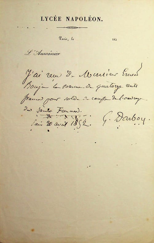 Georges Darboy (1813-1871), évêque de Nancy puis archevêque de Paris, fusillé par la Commune le 24 mai 1871. L.A.S., Paris, 20 avril 1852, 1/2p in-8. Au riche bibliophile aidant les écrivains, Ernest Bouju (1816-1893). « J'ai reçu de Monsieur Ernest Bouju (1816-1893) la somme de quatorze cents francs pour solde de compte de l'ouvrage des Saintes Femmes. G Darboy ». Ouvrage publié en 1850. [384]
