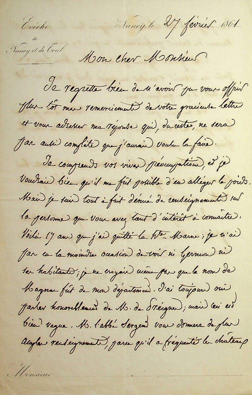 Georges Darboy (1813-1871), évêque de Nancy puis archevêque de Paris, fusillé par la Commune le 24 mai 1871. L.A.S., Nancy, 27 février 1861, 2p in-8. Au riche bibliophile aidant les écrivains, Ernest Bouju (1816-1893). Il ne peut donner de renseignements sur M. Magnac, de la Haute-Marne. « voilà 7 ans que j'ai quitté la Haute-Marne, je n'ai pas eu la moindre occasion de voir ni [?] ni ses habitants ; je ne croyais même pas que le nom de Magnac fût de mon département ». Il lui conseille de demander à l'abbé Sergent. [385]