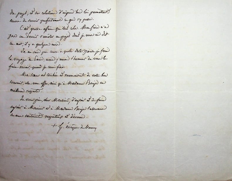 Georges Darboy (1813-1871), évêque de Nancy puis archevêque de Paris, fusillé par la Commune le 24 mai 1871. L.A.S., 29 novembre [1848], 3p in-8. Au riche bibliophile aidant les écrivains, Ernest Bouju (1816-1893). Longue lettre autour de la publication des Saintes Femmes et la promotion qu'il faut en faire. Il est notamment question d'une note à envoyer à « M. Lacroix », probablement Paul Lacroix. Cette note faisait la 3e page, a été en grande partie barrée, une partie coupée et ensuite recollée (cachant quelques mots). On joint deux pages de notes sur ses sources et une enveloppe autographe au même datée de 1863. [386]