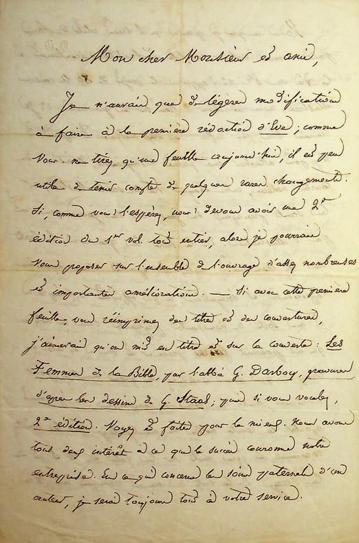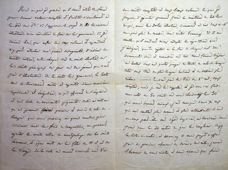 Georges Darboy (1813-1871), évêque de Nancy puis archevêque de Paris, fusillé par la Commune le 24 mai 1871. L.A.S., 20 octobre [ca.1848], 4p in-8. Au riche bibliophile aidant les écrivains, Ernest Bouju (1816-1893). Longue et belle lettre sur la préparation de son ouvrage Les Femmes de la Bible et des modifications qu'il souhaiterait. Il approuve le projet de publier le livre en 80 livraisons, puis discute de la construction de l'ouvrage sur les Saints, du choix des saints présentés, etc. Il donne notamment une longue liste de saints en précisant ceux qu'il pense plus a propos de traiter. Très intéressante lettre. [385]