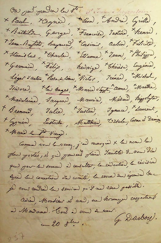 Georges Darboy (1813-1871), évêque de Nancy puis archevêque de Paris, fusillé par la Commune le 24 mai 1871. L.A.S., Paris, 26 juillet 1853, 1p in-8. Au riche bibliophile aidant les écrivains, Ernest Bouju (1816-1893). « Mgr [Sibour] a reçu l'exemplaire de la Vie des saints que vous lui avez fait parvenir et la gracieuse lettre que vous y avez jointe. Il vous remercie doublement et me charge de vous dire qu'il s'en réfère au témoignage d'encouragement qui a été accordé à votre oeuvre par son prédécesseur, Mgr Affre. Le nombre des livres proposés à l'examen est trop considérable et la commission compte trop peu de membres pour qu'on puisse suffire au travail qui serait nécessaire. Tout en applaudissant aux efforts des éditeurs aussi bien intentionnés que vous, Mgr désire n'être point appelé désormais à donner à leurs publications aucune approbation explicite. Mgr, qui a parcouru votre livre avec curiosité et intérêt, veut que j'ajoute encore un mot : il regrette que votre imprimeur n'ait pas mieux fait coïncider le texte avec quelques-unes de vos illustrations d'ailleurs si pittoresques. Agréez, Monsieur, l'assurance de mes sentiments respectueux et dévoués. G Darboy, vic.gén. ». [385]