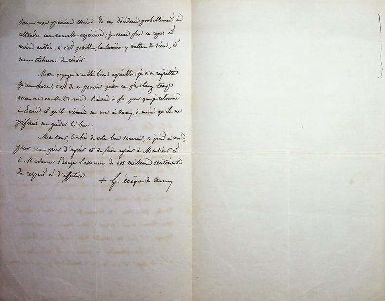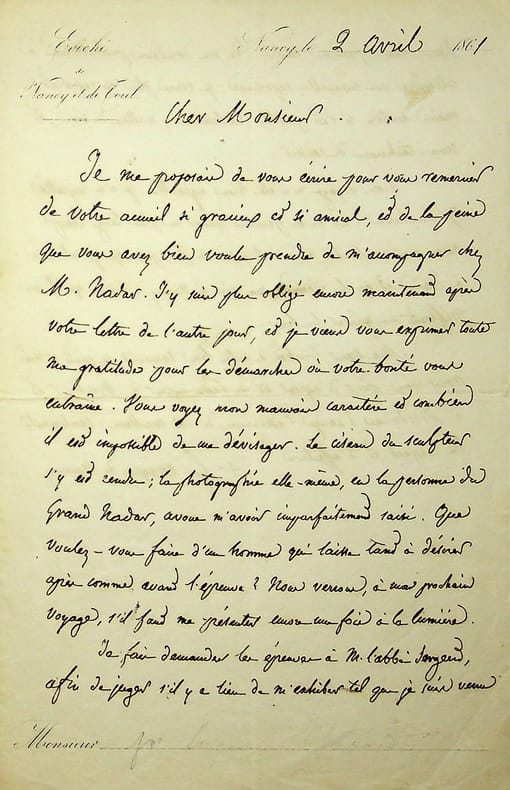 Georges Darboy (1813-1871), évêque de Nancy puis archevêque de Paris, fusillé par la Commune le 24 mai 1871. L.A.S., Nancy, 2 avril 1861, 1p 1/2 in-8. Au riche bibliophile aidant les écrivains, Ernest Bouju (1816-1893). Belle lettre de remerciements après un voyage à Paris pendant lequel Bouju l'a amené chez le « Grand Nadar » mais « Vous voyez mon mauvais caractère et combien il est impossible de me dévisager. Le ciseau du sculpteur s'y est rendu ; la photographie elle-même, en la personne du Grand Nadar, avoue m'avoir imparfaitement saisi. Que voulez-vous faire d'un homme qui laisse tant à désirer après comme avant l'épreuve ? ». Il se propose de réessayer. Nous n'avons trouvé qu'un portrait par Nadar publié sans savoir si c'est ce premier essai imparfait ou un autre. [386]