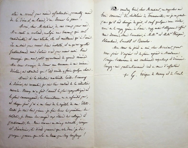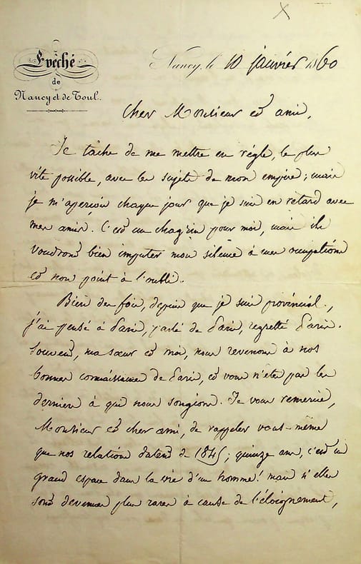 Georges Darboy (1813-1871), évêque de Nancy puis archevêque de Paris, fusillé par la Commune le 24 mai 1871. L.A.S., Nancy, 10 janvier 1860, 2p 1/2 in-8. Au riche bibliophile aidant les écrivains, Ernest Bouju (1816-1893). Longue et belle lettre amicale de voeux, donnant quelques nouvelles. [386]