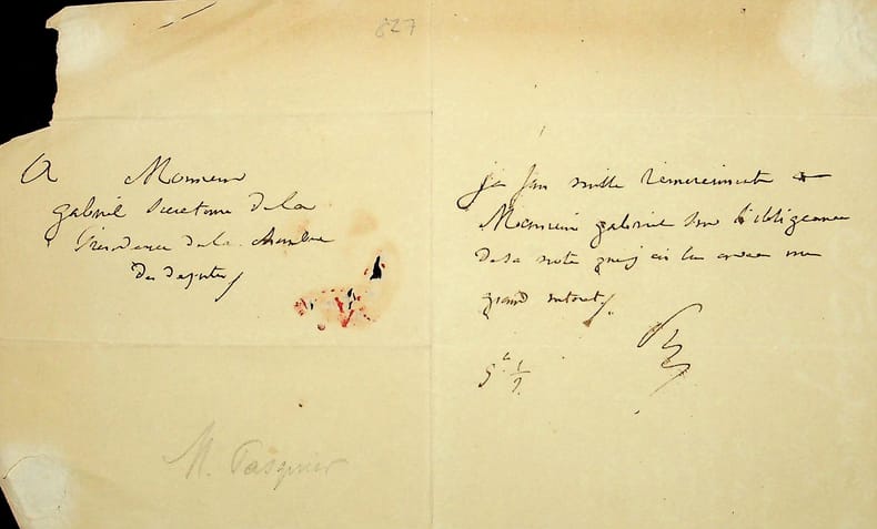 Etienne-Denis Pasquier (1767-1862), dit le chancelier Pasquier, préfet de police, ministre, président de la chambre des députés puis de la chambre des pairs, duc, membre de l'Académie française. L.A.S., sd [5h 1/2], 1p in-12. A M. Gabriel, secrétaire de la Présidence de la Chambre. Remerciements pour une note. [486]