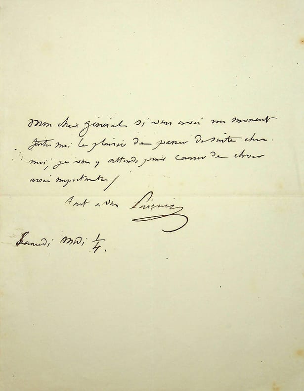 Etienne-Denis Pasquier (1767-1862), dit le chancelier Pasquier, préfet de police, ministre, président de la chambre des députés puis de la chambre des pairs, duc, membre de l'Académie française. L.A.S., sd [samedi midi 1/4], 1/2p in-4. Vraisemblablement à Jean-Jacques Germain Pelet Clozeau (1777-1858), général, baron. « Mon cher général, si vous avez un moment, faites-moi le plaisir de passer de suite chez moi, je vous y attends pour causer de choses assez importantes. Tout à vous. Pasquier ». [486]
