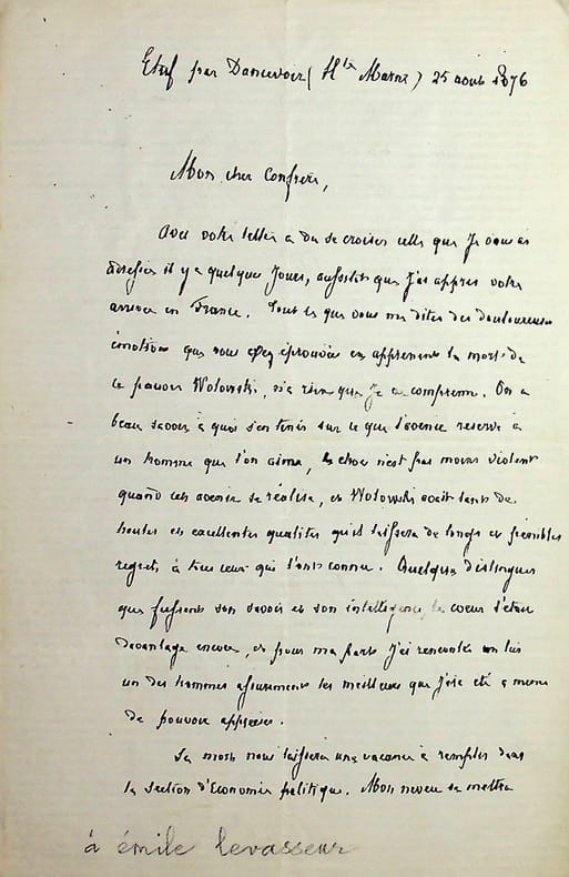 Hippolyte Passy (1793-1880), économiste, homme politique, ministre, président de la chambre des députés. L.A.S., Etuf par Dancevoir, 25 août 1876, 2p in-8. A l'historien, économiste et géographe Pierre-Emile Levasseur (1828-1911). Belle lettre autour de la mort du juriste et économiste Louis Wolowski (1810-1876), le 14 août : « ce Wolowski avait tant de hautes et excellents qualités qu'il laissera de longs et pénibles regrets à tous ceux qui l'ont connu ». Il est aussi question de sa succession à la Section d'Economie Politique (de l'Académie des Sciences morales et politiques) où il veut placer son neveu Frédéric Passy (1822-1912), futur prix Nobel de la Paix en 1901. Cette élection aura, selon H Passy, lieu en novembre. L'élection eut finalement lieu en 1877 et c'est bien Frédéric Passy qui sera élu. On notera d'ailleurs que la fille de Wolowski avait épousé un autre neveu, Louis Passy. Belle lettre. [487]