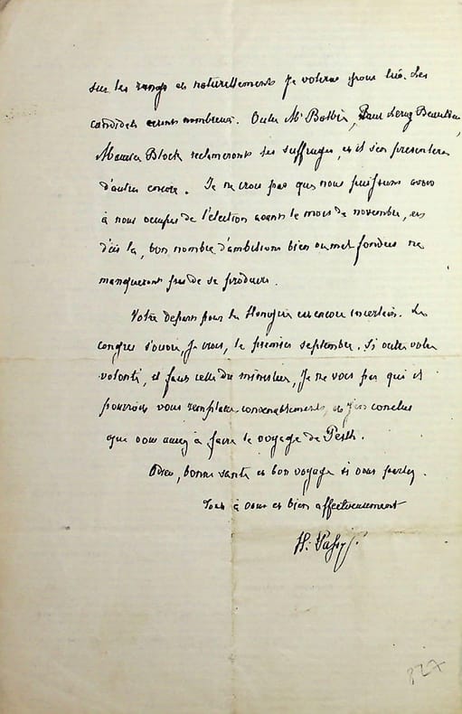 Georges Pallain (1847-1923), fonctionnaire, gouverneur de la Banque de France. L.A.S., 22 août 1904, 1p 1/4 in-8. A l'historien, économiste et géographe Pierre-Emile Levasseur (1828-1911). Il soutient Levasseur dans son choix d'André Liesse (1854-1944) pour l'Institut international de Statistique. Levasseur cherchait en effet à y placer ses proches, Liesse peut être considéré comme un de ses disciples. Il sera d'ailleurs son successeur à l'Académie des Sciences morales et politiques. [486]