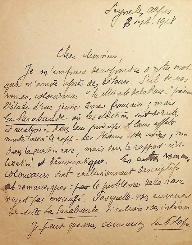 Georges Athénas dit Marius Leblond (1877-1953), écrivain, historien, journaliste. L.A.S., Seyne-les-Alpes, 8 septembre 1928, 2p in-12. A l'écrivain Maurice Wilmotte (1861-1942). Intéressante lettre autour de ses romans (écrits avec Ary Leblond) : « Seul de nos romans "Le Miracle de la race" présente l'étude d'une jeune âme française ; mais La Sarabande où mes élections sont décrites et analysées dans leur principe et leurs effets montre aussi les rapports des Blancs et des Noirs, non dans la question race, mais sous le rapport civilisation démocratique. Les autres romans coloniaux sont exclusivement descriptifs et romanesques : le problème de la race n'y est pas envisagé ». [489]