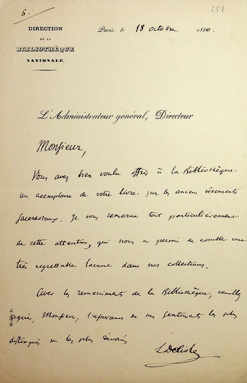 Léopold Delisle (1826-1910), historien, bibliothécaire. L.A.S., Paris, 18 octobre 1880, 1p in-8. Peut-être à l'archéologue Charles de Linas (1812-1887). Il le remercie pour l'envoi à la BnF de son livre sur les anciens vêtements sacerdotaux. [489]