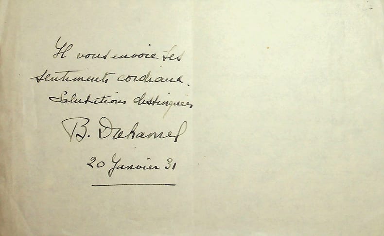Blanche Albane dite Blanche Duhamel (1886-1975), actrice, épouse de l'écrivain Georges Duhamel. L.A.S., 20 janvier 1931, 3p in-12. A l'écrivain Maurice Wilmotte (1861-1942). Elle écrit au nom de son mari à propos de conférences qu'il doit faire en Belgique, qui sont déjà annoncées mais pour lesquelles Wilmotte et Duhamel ne se sont pas encore mis d'accord. Jolie lettre. [489]