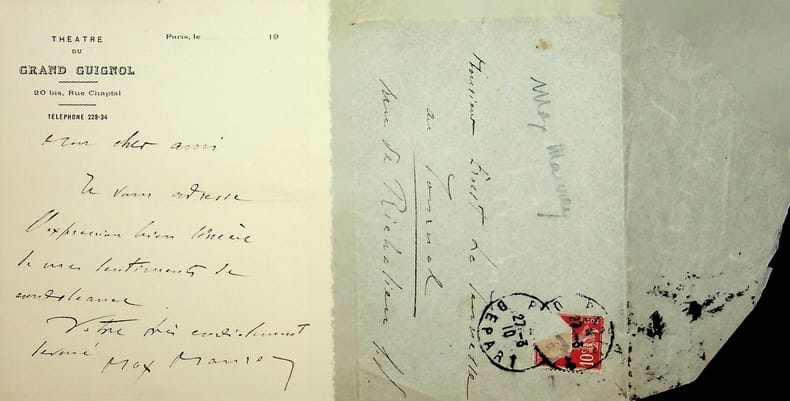 Max Maurey (1866-1947), écrivain, directeur de théâtres. L.A.S. + enveloppe, 27 mars 1910, 1p in-12. Entête du théâtre du Grand Guignol. A l'écrivain Ernest La Jeunesse (1874-1917). « Mon cher ami, je vous adresse l'expression bien sincère de mes sentiments de condoléances. Votre très cordialement dévoué Max Maurey ». [490]
