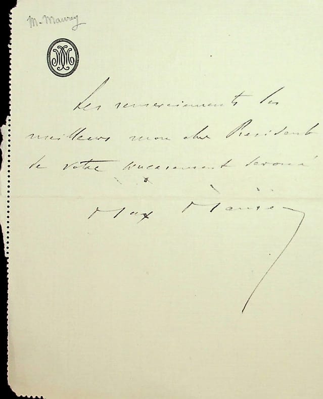 Max Maurey (1866-1947), écrivain, directeur de théâtres. L.A.S., 18 août 1908, 1p in-12. A l'homme politique Paul Escudier (1858-1931) : « Les remerciements les meilleurs mon cher Président de votre sincèrement dévoué Max Maurey ». [490]