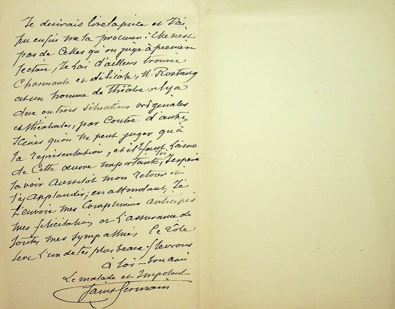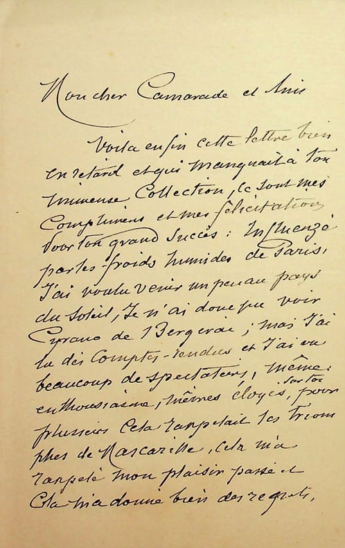 [Edmond Rostand, Cyrano de Bergerac] Gilles de Saint Germain (1833-1899), acteur notamment de l'Odéon, de la Comédie française et du Vaudeville. L.A.S., sd [après le 28 décembre 1897], 2p in-8. A Coquelin aîné (1841-1909). Belle lettre de félicitations pour « son grand succès » qu'il n'a pu voir étant absent et malade. « mais j'ai les comptes-rendus et j'ai vu beaucoup de spectateurs, même enthousiasme, mêmes éloges sur toi, pour plusieurs cela rappelait les triomphe de Mascarille ». Il s'est procuré la pièce et a pu la lire. « M. Rostang [sic] est un homme de théâtre. Il y a deux ou trois situations originales et théâtrales, par contre d'autres scènes qu'on ne peut juger qu'à la représentation ». Il verra la pièce à son retour. Mascarille fait référence à l'un des grands succès de Coquelin quand il joué ce rôle dans L'étourdi (Molière) à la Comédie-Française en 1871. Très belle lettre. [490]