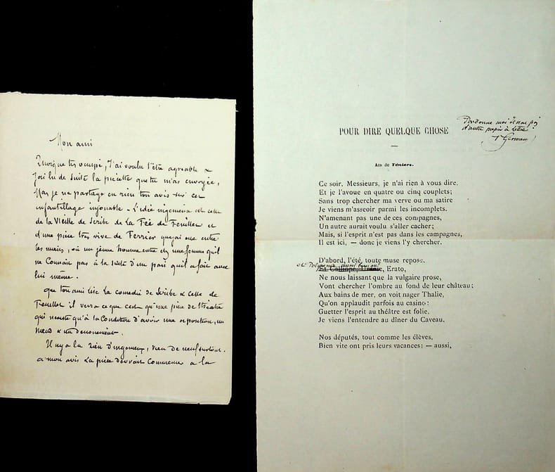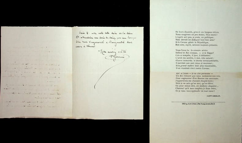 Gilles de Saint Germain (1833-1899), acteur notamment de l'Odéon, de la Comédie française et du Vaudeville. L.A.S., ca.1872, 1p 1/2 in-12. A Coquelin aîné (1841-1909). Critique d'une « piécette » envoyée par Coquelin. « Je ne partage en rien ton avis sur cet enfantillage injouable », qu'il rapproche de pièces de Scribe et Feuillet, pièces qu'il conseille à l'auteur, ami de Coquelin, de lire. On joint un poème imprimé, « pour dire quelque chose » qui était le second feuillet de cette lettre. C'est un poème (chanson) de Saint Germain, imprimé par Jules Juteau, avec une correction et une note « pardonne moi je n'ai pas d'autre papier à lettre. St Germain ». [490]