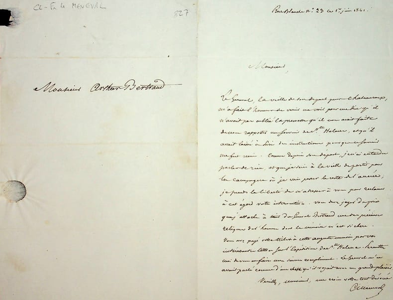 Claude François de Méneval (1778-1850), écrivain, secrétaire intime de Napoléon Ier, mémorialiste. L.A.S., 1er juin 1841, 1p in-8. Au libraire Jean-Baptiste Arthus-Bertrand à propos de reliques napoléoniennes promises par le général Bertrand. « Monsieur, Le Général [Henri-Gatien Bertrand], la veille de son départ pour Chateauroux, m'a fait l'honneur de venir me voir pour me dire qu'il n'avait pas oublié la promesse qu'il nous avait faite de nous rapporter un souvenir de Sainte Hélène et qu'il avait laissé à Paris des instructions pour que ce souvenir me fut remis. Comme depuis son départ, je n'ai entendu parler de rien, et que je suis à la veille de partir pour la campagne où je vais passer le reste de l'année, je prends la liberté de m'adresser à vous pour réclamer à cet égard votre intervention. Vous devez juger du prix que j'attache à tenir du général Bertrand une des précieuses reliques de l'homme dont la mémoire m'est si chère. Vous avez payé votre tribut à cette auguste mémoire par vos intéressantes lettre sur l'expédition de Sainte Hélène. Permettez-moi de vous faire mon sincère compliment. Le général m'en avait parlé comme d'une chose qu'il voyait avec un grand plaisir. Veuillez, monsieur, me croire votre tout dévoué. CMeneval ». Très sympathique lettre. [490]
