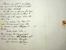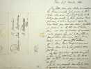 Henri-Gatien Bertrand (1773-1844), général, compagnon de Napoléon à Sainte-Hélène. L.A.S. « B », « En route sur la rivière de Seine, près Marly, 14 décembre 1840, 3p in-8. A son frère Louis Bertrand de Boilarge (1774-1861), la veille de l'arrivée des cendres de Napoléon à Paris par bateau, sur lequel était donc Bertrand. « Cher frère, j'ai vu hier soir Henri, Alphonse et Amédée qui sont venu à bord, le Prince l'ayant permis et j'ai appris que le froid te retenait à Chateauroux. Je regrette donc beaucoup de ne t'avoir pas écrit à Chateauroux mais Hortense t'aura probablement envoyé mes lettres. Arthur a été la voir avant hier, l'a trouvée belle, fraiche et engraissée. Amédée me l'a confirmé hier. Elle viendra à la cérémonie, mais elle y aura bien froid. Nous avons passé rapidement des chaleurs des tropiques au froid de décembre. Il gèle, et nous nous en apercevons quand nous paraissons immobiles sur le pont, aux coins du cercueil, un vent glacial dans la figure. Demain à cheval, nous n'aurons pas chaud. C'est de beaux coups d'oeil que ceux que nous ont offerts les populations réunies sur les bords de la Seine, malgré la rigueur de la saison. Au printemps, le voyage de la Seine est fort agréable. Avant hier, le duc d'Aumale et hier le duc d'Orléans sont venus. Le duc d'Elchingen m'a donné de bonnes nouvelles de Nap que m'a confimées le prince royal. Le cher Nap regrettera bien de n'être pas là. Il parait qu'Alphonse travaille bien. Le petit Nap est un peu mieux m'a dit Amédée. J'ai vu [Armand de] Bricqueville à Cherbourg. Le capitaine de la Dorade sur laquelle est le cercueil est un ancien officier de marine, qui connait le capitaine [nom illisible]. Nous continuons à bien nous porter. Le Roi a montré une grande bienveillance pour Arthur et pour moi. La Reine a envoyé deux billet à Hortense. Je ne sais s'il y aura une occasion [mot illisible] à temps pour que cette lettre parte aujourd'hui. Je vous embrasse tous [liste de personnes] toi en tête cher frère. B. Sur un bateau qui marche avec des mains froides [fin illisible] ». Nap est Napoléon Bertrand, un des fils du général. Belle lettre, beau témoignage de premier ordre. [491]
