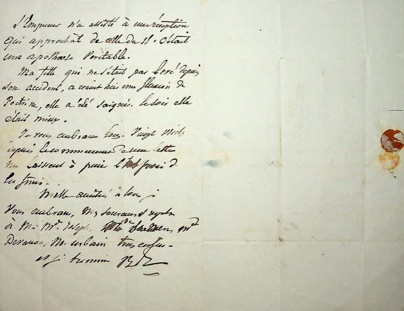 Henri-Gatien Bertrand (1773-1844), général, compagnon de Napoléon à Sainte-Hélène. L.A.S. « B », près du Pont-de-l'Arche, 10 décembre 1840, 1p in-8. A sa fille Hortense (1810-1889), épouse de l'homme politique Amédée Thayer (1799-1868), quelques jours avant la cérémonie pour le retour des cendres de Napoléon, alors qu'il est sur le bateau qui remonte la Seine vers Paris. « A Rouen, cher Hortense, j'ai reçu ta bonne lettre du 7. Je te vois bien souffrante et ton cher petit beaucoup plus malade que je ne pensais. Le [mot illisible] te conservera, j'espère, ce cher enfant, et si je le lui demande, ma bonne Hortense, Arthur te fait mille et mille amitiés. Nous verrons le cher Henri. Mes souvenirs affectueux à madame Thayer, madame Marie et tout ce qui t'entoure. J'ai fait mettre à la porte de Rouen m'a lettre d'hier 9. À toi du fond du coeur. B. Le général Gourgaud me charge de le rappeler à ton souvenir. M. Hernon(?) qui est revenu hier de Paris nous dit qu'il a cent mille demandes pour l'église des Invalides, qu'on en avait demandé pour le Prince, mais qu'aucune n'était encore parvenue. Auras-tu la tienne ? Le prince a écrit au Roi ». La seconde page porte une lettre du fils, Arthur Bertrand (1817-1871). Le fils d'Hortense, Napoléon (1832-1842), était très malade et mourra donc le 21 février 1842. Belle lettre [491]