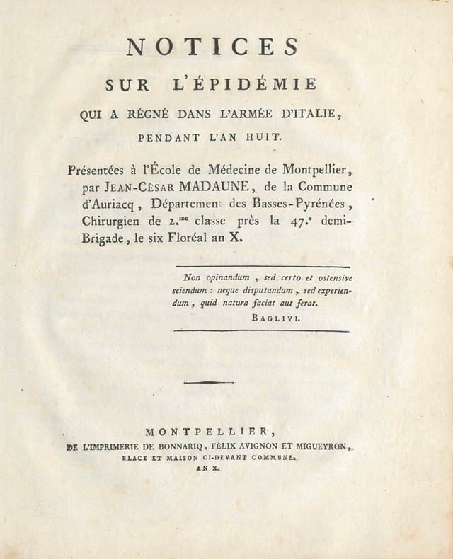 A échappé à V. Rozier.L'auteur était chirurgien de 2e classe à la 47e demi-brigade en quartier dans St Remo où elle fut réduite au tiers de son effectif.Bon exemplaire
