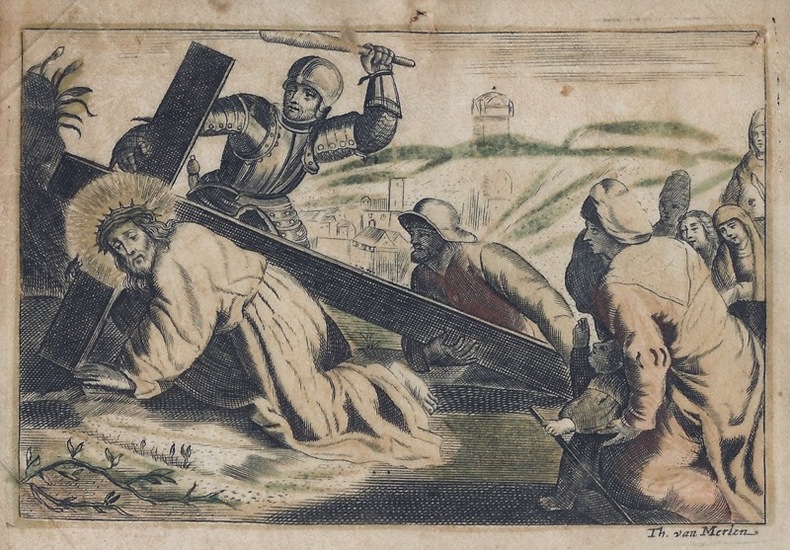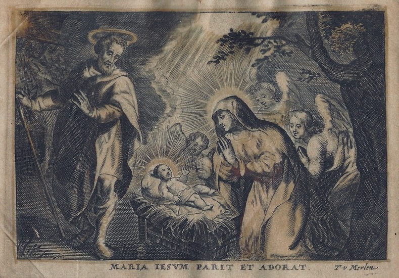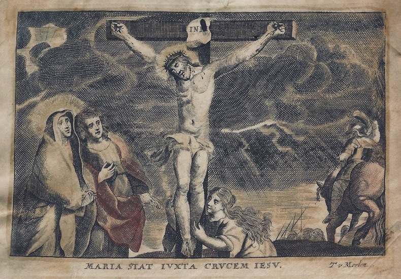 F. W. H. Hollstein, Dutch and Flemish etchings engravings and woodcuts, ca. 1450-1700, Amsterdam, M. Hertzberger, 1956, vol. XIV, pp. 12-13.Jolie suite dessinée et gravée en taille-douce par Theodor van Merlen (1609-1672) représentant des scènes de la vie de Jésus et de la Vierge. Elle comprend 15 planches en largeur, dont un frontispice en hauteur avec portrait allégorique de l’auteur.Graveur, éditeur et marchand d’estampes issu d’une dynastie d’artistes actifs à Anvers au XVIIe siècle, Theodorus van Merlen ou Theodoor van Merlen, fut essentiellement graveur de traduction. Il réalisa des œuvres d’après les dessins de P. van Avont, P. P. Rubens, Abraham van Diepenbeeck, David Teniers, Ph. de Champagne, etc.Exceptionnelles et rarissimes épreuves imprimées sur peau de vélin.Les effets cherchant un certain chromatisme sont rendus par l’artiste grâce à un traitement habile des lignes ; les valeurs sont appliquées avec maîtrise des noirs, dans un jeu qui alterne traits minces et épais, obliques et perpendiculaires, très bien établis par un burin ferme et alerte. Ombres et lumières sont distribués harmonieusement, conférant aux épreuves sur vélin une richesse extraordinaire, qui parfois avoisine avec les effets du camaïeu. La production artistique des Pays-Bas espagnols, grâce à la maison de Habsbourg, connaissait une diffusion sans précédents, qui s’étendait du nord au sud de l’Europe et à l’Amérique, en passant par l’Extrême-Orient, et c’est cette demande liée à l’expansion impériale qui obligeait les éditeurs et marchands d’estampes de l’époque à faire, outre des tirages ordinaires sur papier, des tirages exceptionnellement solides sur des supports aussi résistants que la peau de vélin, destinés parfois à voyager jusqu’aux confins de l’empire des rois d’Espagne.Ce type de gravures, appelées parfois « estampes de la foi », étaient aussi tirées sur des supports particulièrement résistants et solides, comme c’est le cas de notre suite, et elles servaient aux œuvres d’évangélisation de la part de missionnaires dans des contrées lointaines où les conditions climatiques rendaient la conservation des images pieuses très aléatoire