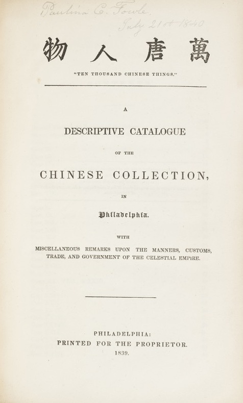Titre, 120 pp.Seulement deux exemplaires au CCF (Muséum, Institut de France). Premier catalogue de la fameuse collection Dunn. C'est en effet en 1838 que s'était ouvert à Philadelphie le "Chinese Museum", au premier niveau du Musée de Charles Willson Peale, sur la base des objets rapportés de Chine par le négociant quaker Nathan Dunn (1782-1844), revenu d'un long séjour commercial à Canton (1818-1832). L'ensemble de cette collection fut montrée également à Londres en 1842, puis, après la mort de Dunn, en 1851, la seconde fois avec beaucoup moins de succès. Le sort des objets qui la composaient demeure obscur, mais elle fut victime de son succès et semble avoir été à la fois pillée par des amateurs peu scrupuleux et dispersée aux enchères (ce qui revient à peu près au même).Exemplaire de Paulina Cazenove Fowle (1806-1891), avec ex-libris manuscrit daté du 21 juillet 1840