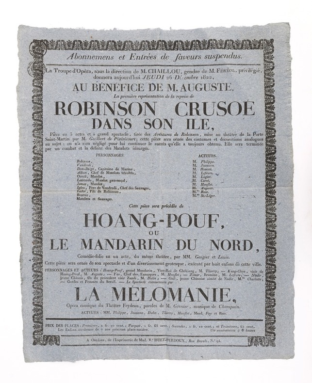 Texte dans un encadrement de feuillages, imprimé sur papier bleuté.Belle et rare affiche de spectacle invitant à une représentation provinciale d'un grand succès parisien. En effet, Robinson Crusoé, créé et représenté pour la première fois en 1805 au Théâtre de la Porte Saint-Martin, forma l'un des spectacles les plus réussis de René-Charles Guilbert de Pixerécourt (1773-1844) : il garda l'affiche toute l'année 1805 à Paris