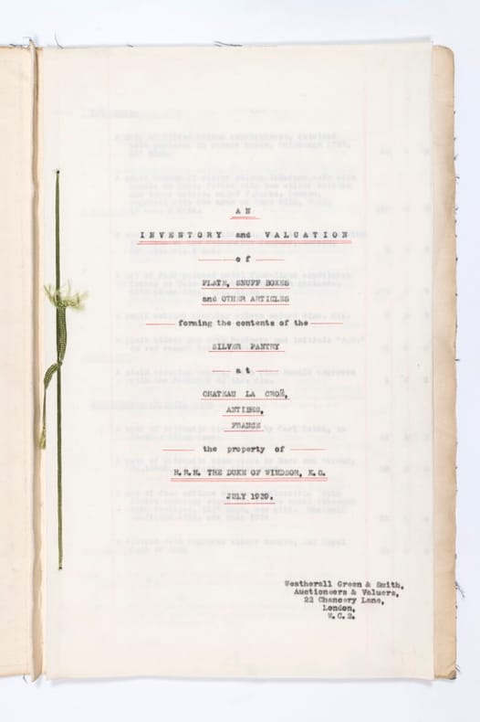 Titre, 29 ff. anopisthographes réglés, le tout dactylographié.Exceptionnel inventaire de l'argenterie du duc de Windsor, ex-Edouard VIII (1894-1972). Après le mariage de l'ancien souverain avec Wallis Simpson le 3 juin 1937, le couple s'installa de 1938 à 1949 dans une grande bâtisse de style victorien construite en 1927 sur la baie d'Antibes, le château de La Croë. Mais le duc fut rappelé en Grande-Bretagne en septembre 1939 au moment du déclenchement de la guerre