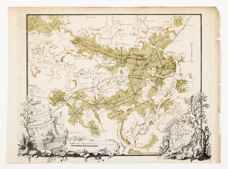 Magnifique plan à l'encre noire et lavis d'encres vertes et brunes représentant toute la région autour de Villers-Cotterêts : depuis la forêt de Compiègne et le Bois des Églises au nord, jusqu'à Crépy-en-Valois et La Ferté-Millon au sud. L'essentiel porte évidemment sur l'ensemble des forêts formant arc de cercle au nord, au sud et à l'est de la localité.Dans la partie inférieure droite, se trouvent les armes de Louis-Antoine du Prat, marquis de Barbançon (1714-1775), gouverneur du château de Villers, premier veneur du Duc d'Orléans depuis 1752 (le château de Villers avait été donné à Monsieur par son frère Louis XIV en 1661, en même temps que l'apanage du comté de Valois, et il faisait depuis partie des possessions des Orléans)