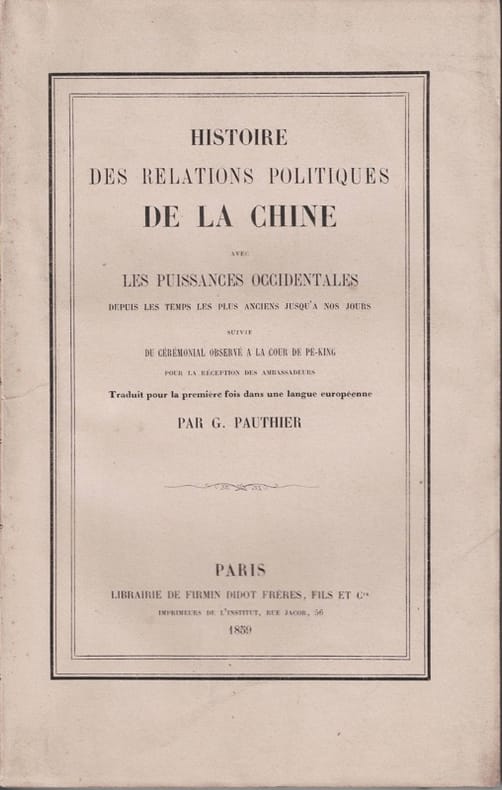 2 ff. n. ch., xx et 238 pp.Unique édition, peu commune, de cette bonne étude des relations conflictuelles entre la Chine et les diplomates européens, qui, depuis MacCartney refusaient généralement le cérémonial en usage à la Cour des Qing pour leur réception. L'orientaliste Jean-Pierre-Guillaume Pauthier (1801-1873) travailla sur plusieurs domaines, mais sa spécialité furent ses traductions du chinois