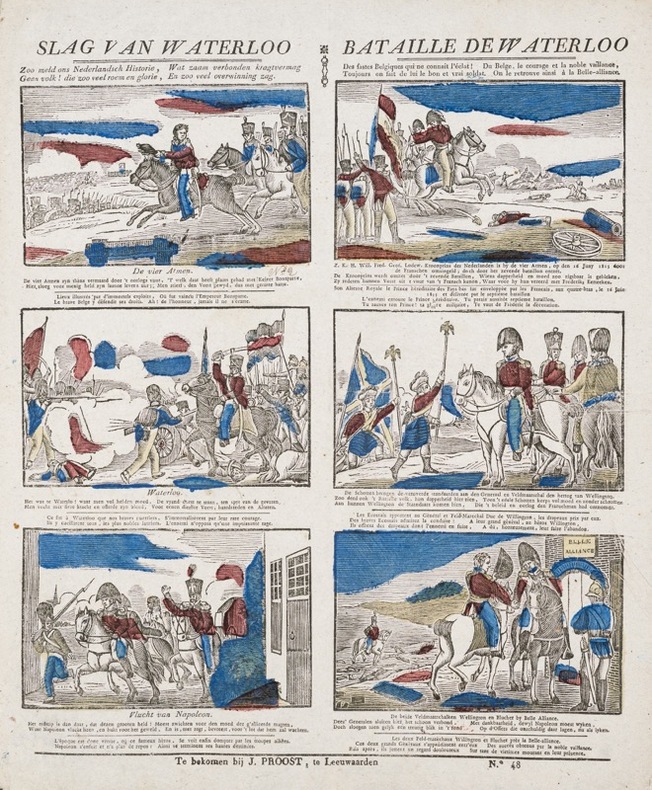 6 bois gravés colorisés représentant les principales étapes de la bataille de Waterloo, avec une insistance particulière sur le comportement des soldats belges (sous les ordres du Prince héréditaire des Pays-Bas, futur Guillaume II)