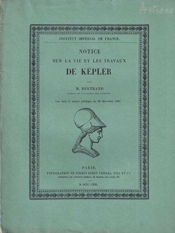 titre, 38 pp.Un des travaux sur l'histoire de l'astronomie composés par Joseph-Louis-François Bertrand (1822-1900), professeur de mathématiques au lycée Saint-Louis, répétiteur, examinateur puis professeur d'analyse en 1852 à l'École polytechnique, maître de conférences de calcul différentiel et intégral à l'École normale supérieure et enfin professeur titulaire de la chaire de physique et mathématiques au Collège de France en 1862 en remplacement de Jean-Baptiste Biot