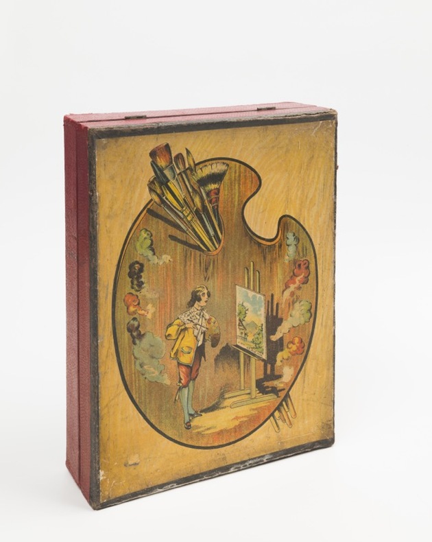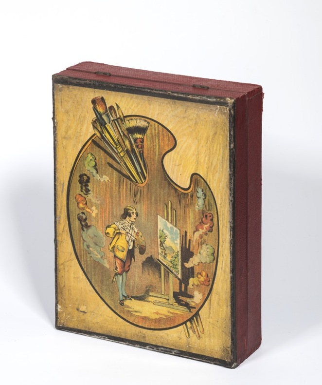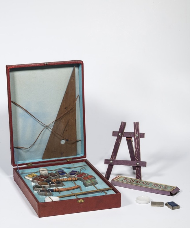 Joli nécessaire pour artiste en herbe, contenant aquarelles, godets en porcelaine, centimètre, équerre en bois, petit chevalet et boîte à fusains.Bien conservé