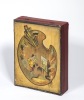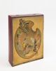 Paris N.K. Atlas s.d. [vers 1910-1920] 20,5 x 27 x 6 cm environ cartonnage papier gaufré rouge pour les bords, fond bleu, vignette illustrée recouvrant le couvercle, fermoir, petite fente au couvercle