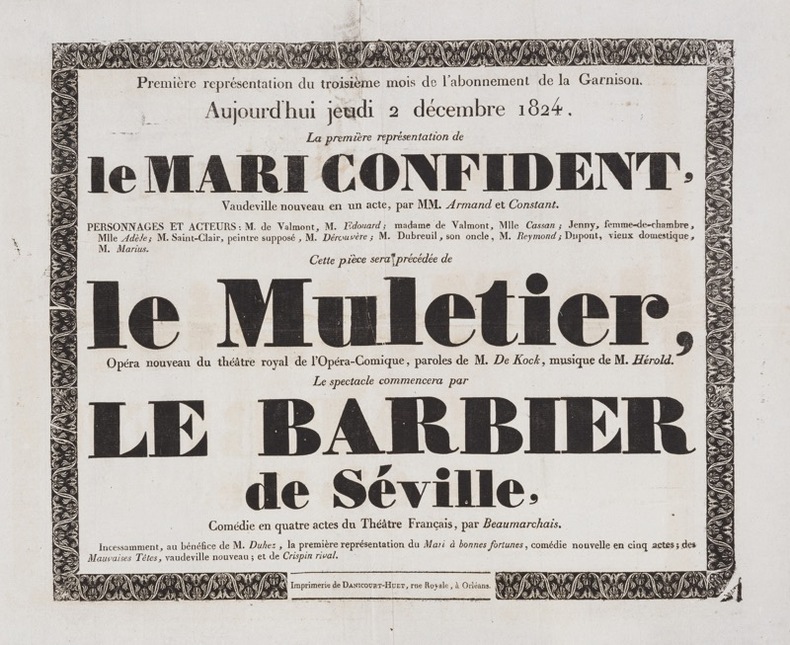 Rare affiche pour une séance réservée aux abonnés de la garnison, et qui regroupe trois pièces : Le Mari confident (1820) d'Armand-Joseph Overnay (1798-1869) ; Le Muletier (1823, opéra de Paul de Kock et de Louis-Ferdinand Hérold d'après la fable de La Fontaine) ; Le Barbier de Séville (la comédie de Beaumarchais)