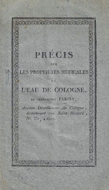 24 pp. avec titre de départ.Précieuse plaquette de Jean-Marie Farina vantant les mérites de son "eau de Cologne".Après le texte décrivant les bienfaits de la célèbre lotion et donnant des conseils pour son administration, on trouve des "Extraits des lettres approbatives" envoyées à l'auteur "par MM. les Docteurs en médecine", la "Copie de l'acte public délivré au Sieur Farina (Jean-Marie) par ses parens les descendans en ligne directe de Jean-Antoine Farina, le seul successeur de l'inventeur Paul Feminis". Les plus récents documents présentés par Farina dans cette brochure datent de 1817, ce qui permet de considérer qu'elle a été imprimée à cette époque.Très rare, comme tous les tirages de cette curieuse brochure.Une autre "version" en a été publiée vers 1826 par Warin-Thierry, à Epernay. Un des arrière-neveux de Giovanni Maria Farina, Giovanni Maria Giuseppe Farina (1785-1864) se présentait comme un descendant et héritier de Féminis, l'inventeur de l'eau dite de Cologne