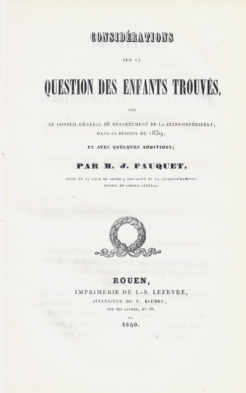 2 ff.n.ch., 32 pp.Frère I, 458. Seulement trois exemplaires au CCF (Rouen, Fécamp, Le Chambon-sur-Lignon). Jacques-Daniel Fauquet (1786-1854) était maire de Bolbec