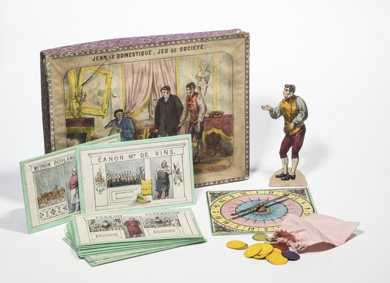 La boîte contient: un personnage en bois découpé, un cadran avec aiguille, 10 planches cartonnées et des jetons.Etonnant jeu de société sur le thème de l'emploi des domestiques.Le brave Jean est envoyé en commission chez différents commerçants figurés sur les cartons illustrés en couleurs: Choublanc fruitier, Canon Md. de vins, Orenbarre horloger et ainsi de suite ! La règle est collée au verso du couvercle