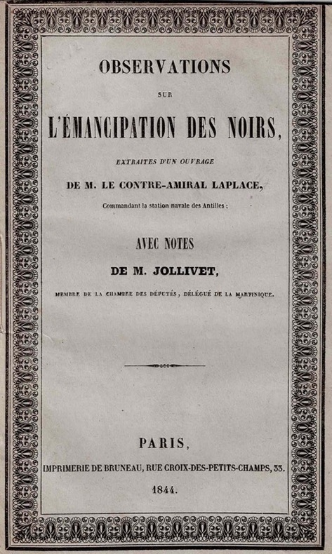 [66] pp. mal chiffrées 58 (il y a saut de chiffrage de 56 à 49). Manque le frontispice.Sabin, 38 984. Seulement deux exemplaires au CCF (BnF et Bordeaux). Très rare extrait de la Campagne de circumnavigation de la frégate l’Artémise, relation parue de 1841 à 1854, et dont les milieux esclavagistes de Martinique avaient opportunément tiré ce passage. A l'issue de sa célèbre circumnavigation, Laplace (1793-1875) commanda la division des Antilles de 1844 à 1847. Il exprime ici le point de vue d'un abolitionniste progressif, hostile à une mesure immédiate et générale, sur la base de ce qu'il a constaté ou cru constater dans les colonies anglaises de l'époque. Le propos est bien résumé par le liminaire, qui se cache derrière la rivalité franco-anglaise traditionnelle : "Le gouvernement anglais cache, sous le masque de la philanthropie, son projet bien arrêté de ruiner, par l'affranchissement des esclaves, toutes les colonies à sucre étrangères"