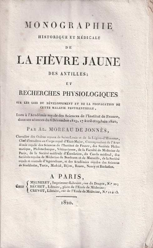2 ff.n.ch., pp. 5-10, 384 pp.Quérard VI, 297. Unique édition de cette monographie médicale, qui appartient aux nombreuses études que Moreau de Jonnès (1778-1870) rapporta de son expérience antillaise. Elle fut curieusement bien accueillie par le corps médical, toujours critique de ce qui n'émane pas de lui, notamment par Chomel, qui en rédigea une recension dans le Nouveau journal de médecine, chirurgie, pharmacie : "M. Moreau de Jonnès a passé un grand nombre d’années dans les colonies ; ses fonctions l’ont placé presque sans cesse au milieu des malades ; il n’est pas médecin mais il a observé l’affection dont il parle ; son ouvrage offre par cela même un genre particulier d’intérêt"