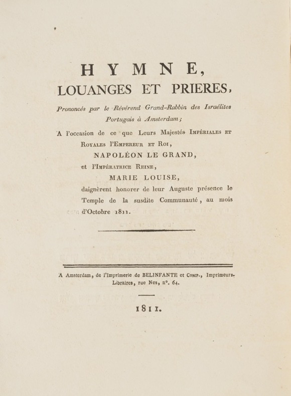 22 pp. Un seul exemplaire au Worldcat. Édition originale et seule édition, avec le texte français en regard du texte hébreu, publiée à l'occasion de la visite de Napoléon à la Synagogue portugaise d'Amsterdam, lors de de sa visite aux Pays-Bas en septembre et octobre 1811.La visite était présidée par le Grand Rabbin de la Synagogue portugaise, Daniel Cohen d'Azevedo (1751-1823) qui, né à Londres, officia à Amsterdam de 1779 à 1812.Napoléon était arrivé le 9 octobre, accueilli par une foule enthousiaste. La Hollande venait d'être annexée à la France et divisée en départements. Napoléon et Marie-Louise devaient passer deux semaines à Amsterdam durant lesquelles ils visitèrent les deux synagogues de la ville.Très rare