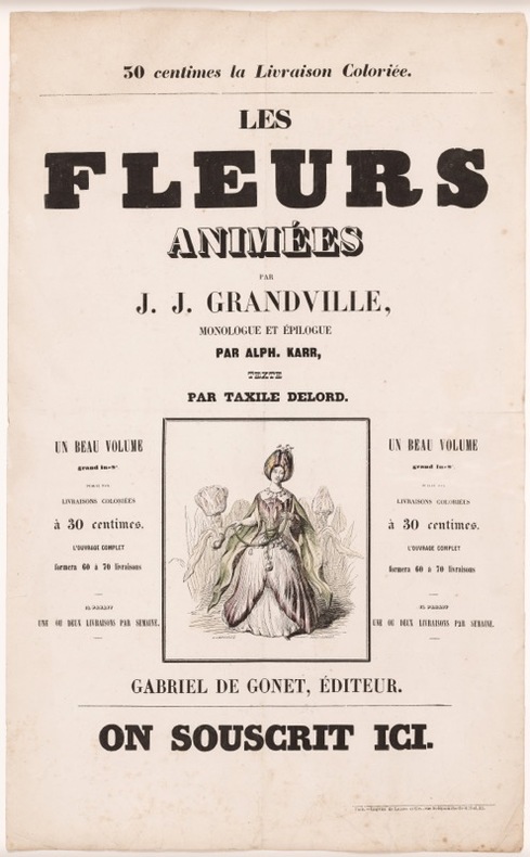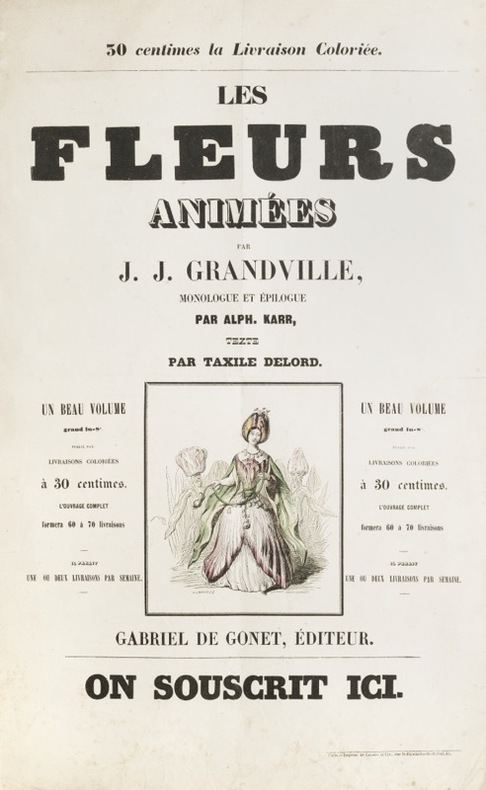 Belle affiche illustrée de souscription pour une des oeuvres majeures de Grandville, parue chez de Gonet en 1847. On notera que la souscription se fait par livraison coloriée au prix de 30 centimes, une ou deux livraisons paraissant par semaine.Rare document, vu son caractère éphémère
