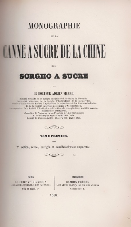 1) x pp.,1 f.n.ch., 262 pp. - 2) 2 ff.n.ch., 210 pp.Cordier, Sinica, 1505. Pritzel 8661. Deuxième édition augmentée. La première édition, publiée en 1856, ne comprenait qu'un seul volume. Etude très documentée sur les emplois alimentaires et tinctoriaux du sorgho à sucre, ou Sorghum bicolor var. saccharatum, une graminée géante cultivée pour sa graine et sa sève riche en sucre. Médecin et agronome marseillais, Adrien Sicard (1816-?) tenta d'acclimater cette plante dans sa région.Culture, croissance, maturité, structure et composition, extraction du jus de la canne, traitement industriel (sucre, alcool, vin, vin-cuit, piquette ou cidre de sorgho, rhum, vinaigre), résidus de distillation, etc.Bon exemplaire de cet ouvrage peu commun