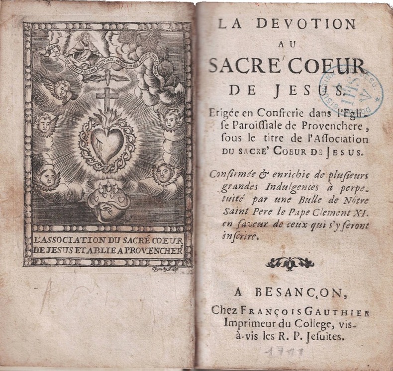 Frontispice gravé par Boudey, 144 pp.L'ouvrage comprend deux parties : 1. De l'essence, de la fin & des motifs de cette dévotion (pp. 11 à 77). - 2. Les principales pratiques de cette dévotion (pp. 78 à 144). Approuvé par l'archevêque de Besançon, il contient les Indulgences accordées par le pape Clément XI à la confrérie de l'Association du Sacré-Coeur de Jésus, ainsi que les règles de cette association, érigée à Provenchere. Il pourrait s'agir de Provenchères-sur-Fave, ou de Provenchères-lès-Darney, ces deux paroisses étant situées dans l'actuel département des Vosges.Dès la fin du XVIIe siècle, la dévotion au Sacré-Coeur se développa de manière spectaculaire non seulement en France, mais dans la catholicité. Resté anonyme, le présent ouvrage évoque ceux de deux pères jésuites, Jean Croiset et François Froment, publiés respectivement en 1691 et 1699 avec des titres similaires, mais présentant une rédaction différente. Il n'est pas cité dans l'étude de Marie-Hélène Froeschlé-Chopard, La dévotion au Sacré-Coeur, confréries et livres de piété, in "Revue de l'histoire des religions", t. 217, n° 3, 2000, pp. 531-546.Ouvrage d'une grande rareté, non mentionné au CCFr. Le seul exemplaire référencé semble être celui de la bibliothèque Grammont, du centre diocésain de Besançon.Sur la page de titre, cachet des Jésuites de Besançon