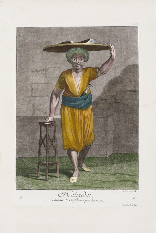 Portrait pittoresque d'après J. B. Van Mour (1671-1737), gravé par Gérard Scotin et colorié.Tiré du Recueil de cent estampes représentant les diverses nations du Levant, tirées d'après nature en 1707 et 1708 par les ordres de M. de Ferriol, ambassadeur du Roy à la Porte (pl.57)