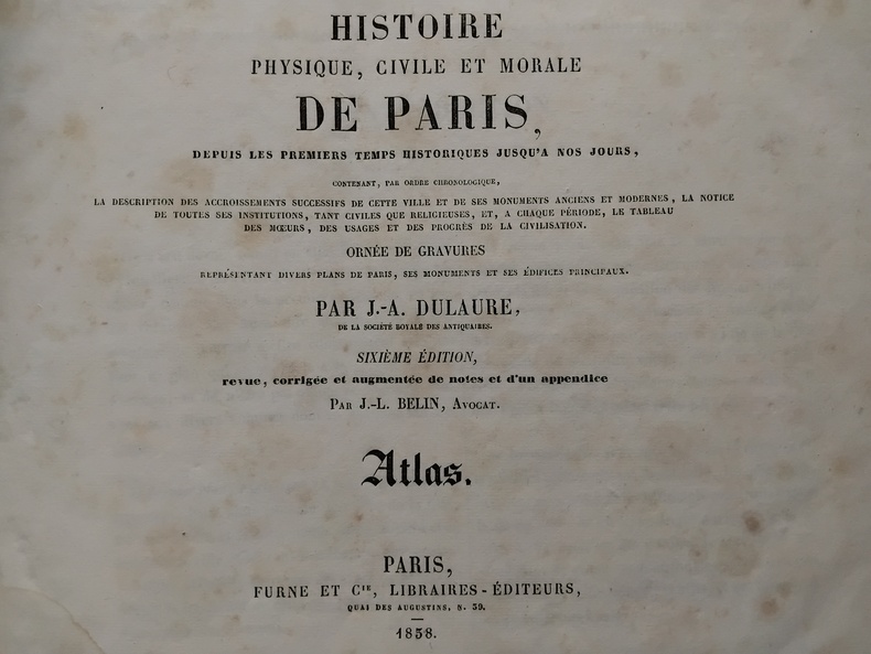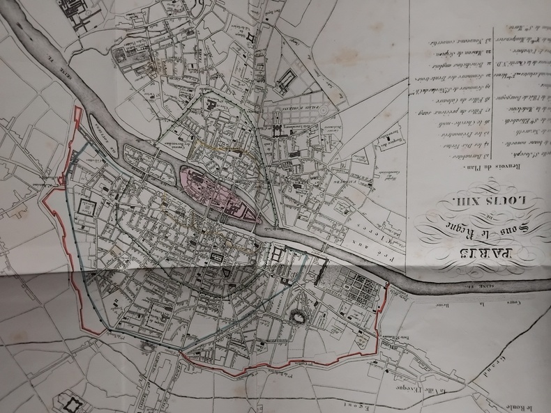 Paris, Furne, 1838. Un volume (21,5 cm x 27 cm), 64 pp et 5 plans dépliants: Plan de Paris sous la domination romaine, Plan de Paris sous le règne de Philippe Auguste, Plan de Paris sous François Ier, Plan de Paris sous le règne de Louis XIII, Plan de Paris en 1838. 1/2 reliure décorée, coiffe usée.