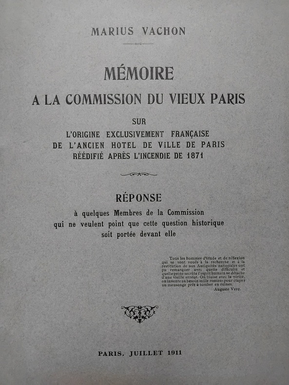 Mémoire à la commission du vieux Paris sur l'origine exclusivement française de l'ancien Hôtel de Ville de Paris réédifié après l'incendie de 1871. Réponse à quelques Membres de la Commission qui ne veulent point que cette question historique soit portée devant elle.