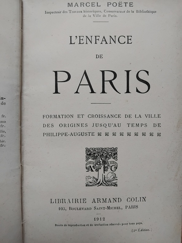 "Dans ce volume, M. Poëte a voulu mettre à la portée du grand public les résultats des travaux auxquels a donné lieu l'histoire de Paris des origines à l'année 1180 et en tirer quelques vues nouvelles sur la formation de l'agglomération parisienne. Il a surtout insisté sur l'intérêt que présente l'étude du sol sur lequel s'est développée cette agglomération, idée juste et féconde." (Revue Historique, 1908) — Table : Paris à la haute époque gallo-romaine ; à la basse époque gallo-romaine ; au VIe siècle ; aux âges mérovingien et carolingien ; Paris et les invasions normandes ; La formation féodale de Paris par les établissements religieux ; Saint-Germain-des-Prés, élément formateur de Paris ; La Cité aux XIe et XIIe siècles ; La rive droite aux XIe et XIIe siècles ; La rive gauche aux XIe et XIIe siècles ; La collectivité parisienne ; Paris, centre intellectuel et artistique (XIIe siècle).