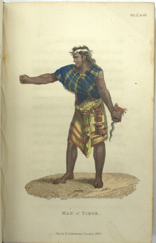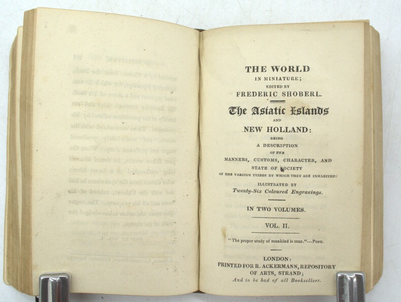 Ce livre illustré, bien que publié séparément, faisait également partie de la série « Le monde en miniature », publiée par Ackermann entre 1821 et 1825, qui comptait quarante-trois volumes et couvrait la plupart des régions du monde, répondant à une demande d'informations sur des lieux exotiques. Les délicieuses planches colorées comprennent des études sur les aborigènes australiens, dont certaines sont reconnaissables comme provenant des publications de voyage de Baudin ou de Freycinet. M2-Et3