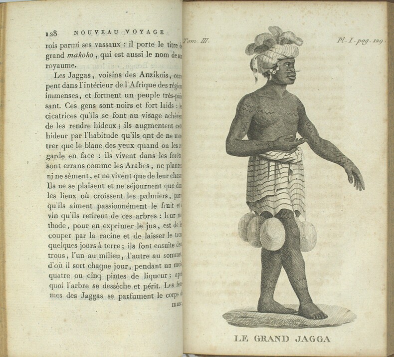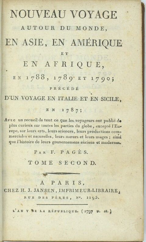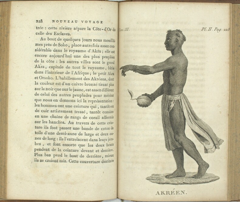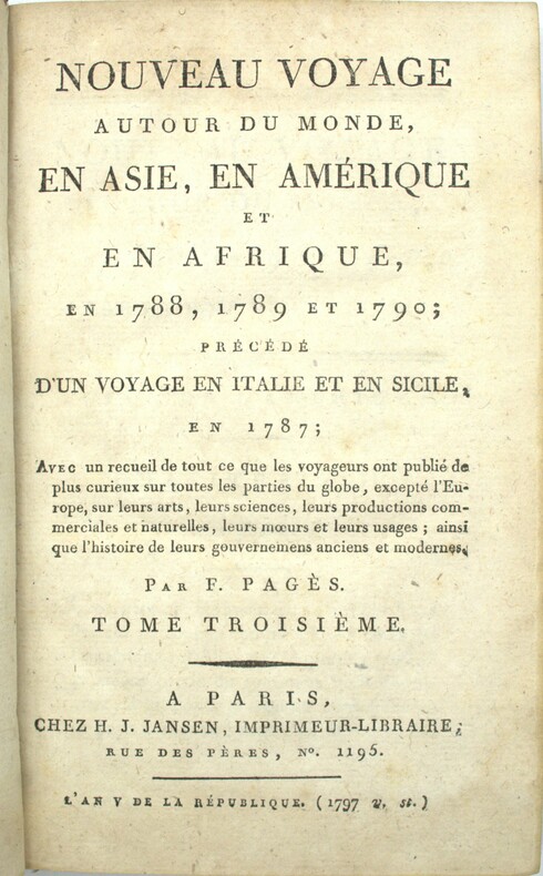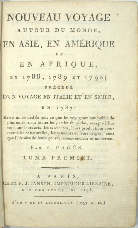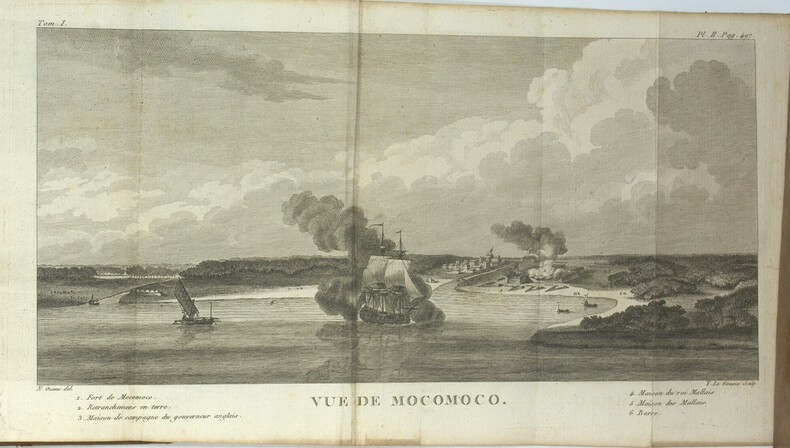 Édition Originale ornée de 6 planches Hors texte dont 4 dépliantes, vue du port de Mascate, vue de Mocomoco, vue de la ville des Cayes, vue de Bombardopolis, costumes du Grand Jagga et costumes des Akéens, « Cet ouvrage contient tout ce qui a paru de plus intéressant dans tous les voyages connus : c'est une véritable encyclopédie pour cette partie, mais dégagée de toutes les inutilités dont les voyages fourmillent ordinairement. On ne trouvera ici ni faits douteux, ni aventures fabuleuses ; mais on y trouvera tout ce qui intéresse la religion, les loix, les mœurs, les usages, le commerce, l'histoire naturelle et les découvertes les plus récentes ; enfin, tout ce qui est vraiment digne des regards d’un philosophe » (introduction). M7-A