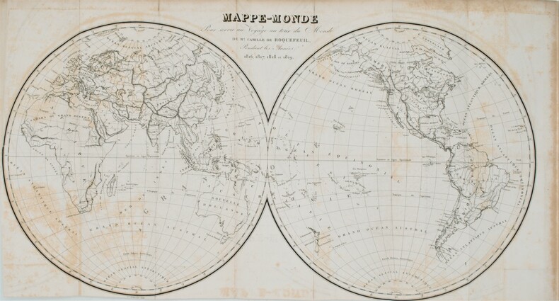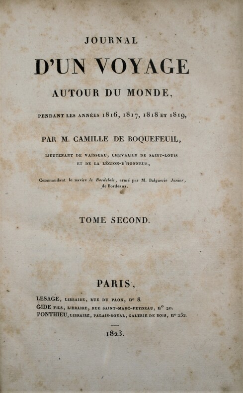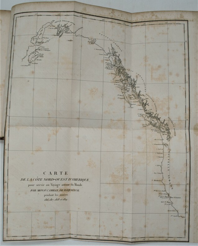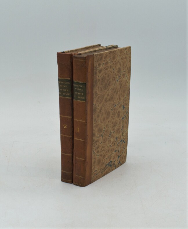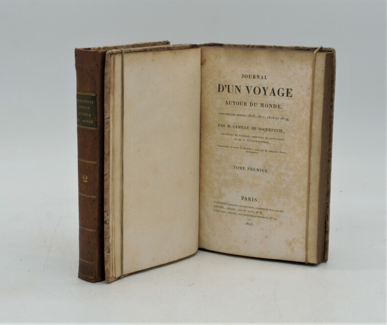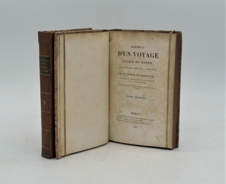 Édition originale, très rare, de ce récit important pour la connaissance du Pacifique Nord au début du XIXe siècle. Publiée par l'un des frères de l'auteur, elle est ornée de 2 cartes dépliantes gravées sur cuivre, dont l'une signée Chassant, représentant une mappemonde et la côte nord-ouest de l'Amérique du Nord. La circumnavigation de Camille-Joseph de Roquefeuil (1781-1831), ancien officier de la Marine royale passé au service d'un armateur bordelais nommé Jean-Étienne Balguerie, dit Balguerie Junior, dura trois ans et le mena au Chili, au Pérou, en Californie, en Alaska, à Hawaii et en Chine. Le but de son voyage était d'établir des relations commerciales avec les Chinois. Le récit de son expédition, écrit à bord de son navire, Le Bordelais, contient principalement des renseignements sur le commerce des pelleteries et du bois de santal entre les Anglais, les Américains et les Chinois, des observations sur la navigation près des côtes nord-ouest de l'Amérique du Nord, et une description très complète de la vie et des mœurs des peuples amérindiens des îles Kodiak en Alaska et de la Colombie britannique (Nootka). On y trouve aussi des détails sur le port de San Francisco, le pays et les missions de Californie. Roquefeuil nous a aussi laissé l'une des plus anciennes, sinon la première, descriptions françaises d'Hawaii, archipel qu'il visita du 8 au 26 janvier 1819, soit six mois avant l'arrivée de Freycinet. Celle-ci renferme notamment des détails sur les habitants et la situation politique de l'île à la fin du règne de Kamehameha († mai 1819). Elle occupe les pp. 339-361 du tome II, une liste des navigateurs qui ont fait le tour du monde et des voyages dans la mer du Sud occupe les pp. XLI-XLIX du tome I, très rare. Original edition, extremely rare, of this important narrative for the knowledge of the North Pacific in the early 19th century. Published by one of the author’s brothers, it includes two folding copper-engraved maps—one signed by Chassant—depicting a world map and the northwest coast of North America. Camille-Joseph de Roquefeuil (1781–1831), a former officer of the Royal Navy turned agent for Bordeaux shipowner Jean-Étienne Balguerie Jr., undertook a three-year circumnavigation aboard Le Bordelais, visiting Chile, Peru, California, Alaska, Hawaii, and China. His goal was to establish commercial ties with China. Written during the voyage, the account provides valuable information on the fur and sandalwood trade between the English, Americans, and Chinese, navigation along the northwest American coast, and detailed ethnographic observations of Indigenous peoples of Kodiak (Alaska) and British Co-lumbia (Nootka). It also includes remarks on San Francisco, the Californian missions, and one of the earliest—possibly the first—French descriptions of Hawaii, visited by Roquefeuil from January 8 to 26, 1819, six months before Freycinet. His notes on Hawaiian society and politics near the end of King Ka-mehameha’s reign appear in vol. II, pp. 339–361. A list of circumnavigators and South Sea voyages appears in vol. I, pp. XLI–XLIX. Very rare. M1-Et2